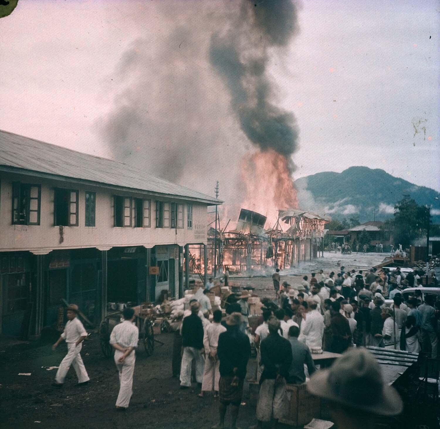 Asap menyerupai awan pekat melayang di atas Berastagi. Orang-orang menyaksikan tindakan besar yang dilakukan petugas pemadam kebakaran untuk menyelamatkan apa yang bisa diselamatkan. (Koran : De Sumatra Post bertanggal : 25-08-1938).