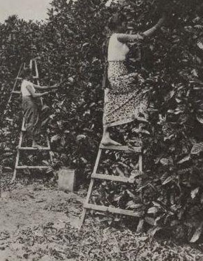 Memetik kopi jang masak (kopi Liberia). Kalau boeah kopi itoe telah mérah roepanja, dipetiklah oléh perempoean-perempoean Djawa, laloe dikoempoelkannja didalam kaléng minjak tanah; kemoedian ditjoetjoerkan kedalam karoeng. Dengan pedati sapi dibawa karoeng-karoeng itoe kepaberik. Disana kopi itoe disediakan lebih djaoeh: koelitnja diboeangkan, laloe dibasikan, soedah itoe dibersihkan dalam air mengalir, dan setelah itoe didjemoer didalam bak pendjemoeran. Kemoedian dimasoekkan lagi kedalam perkakas pengeringkan, sehingga mendjadi keras. Soedah itoe dikoepaslah koelit arinja laloe dipilih didjadikan tiga matjam: besar, menengah dan ketjil, serta jang boesoek-boesoek dikeloearkan.