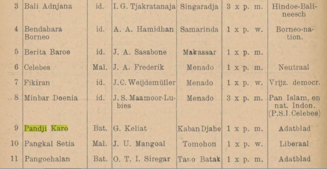 Sebuah majalah bulanan telah terbit dengan nama Pandji Karo di bulan Januari tahun 1929. Pemimpin redaksinya G. Keliat. Memiliki kantor di Kaban Djahe. Selain berbahasa Karo, majalah ini juga memuat beberapa artikel dalam bahasa Melayu.