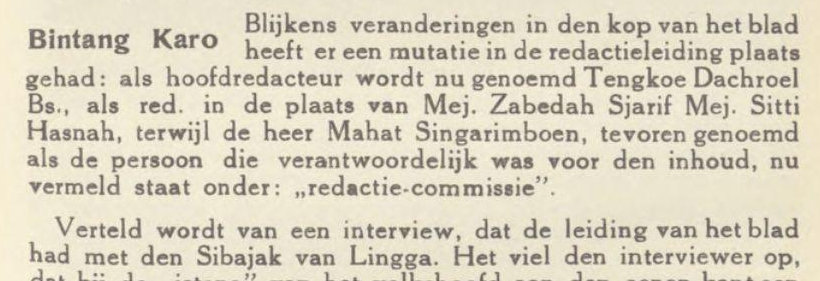 Pada edisi kali ini ada pengumuman perubahan susunan dalam tubuh Bintang Karo. Pimpinan Redaksi sekarang disebut Tengkoe Dachroel Bs. Editor adalah Ms. Abedah Sjarif dan Ms. Sitti Hasnah. Sementara Mr. Mahat Singarimboen, tetap disebutkan sebagai Penanggung Jawab. Ini tercantum dalam kolom “Komite Editorial.”